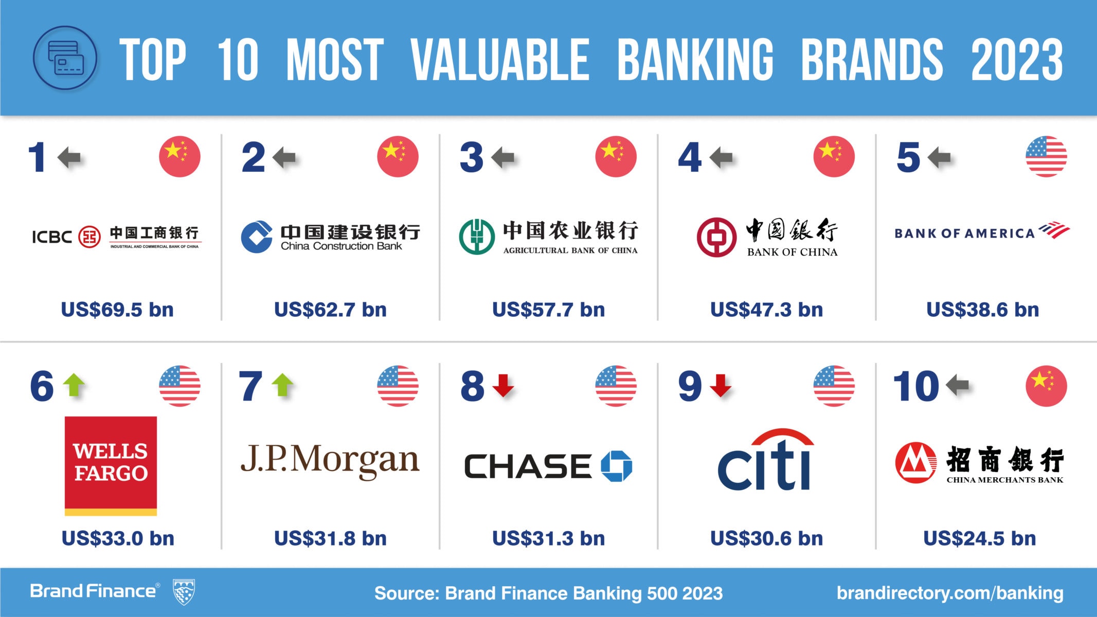 Chinese banking brands are subsiding in brand value with American brands quickly closing the gap. ICBC (brand value down 7% to US$69.5 billion) is the most valuable banking brand in the world, followed by China Construction Bank (brand value down 4% to US$62.7 billion) and Agricultural Bank of China (brand value down 7% to US$57.7 billion).