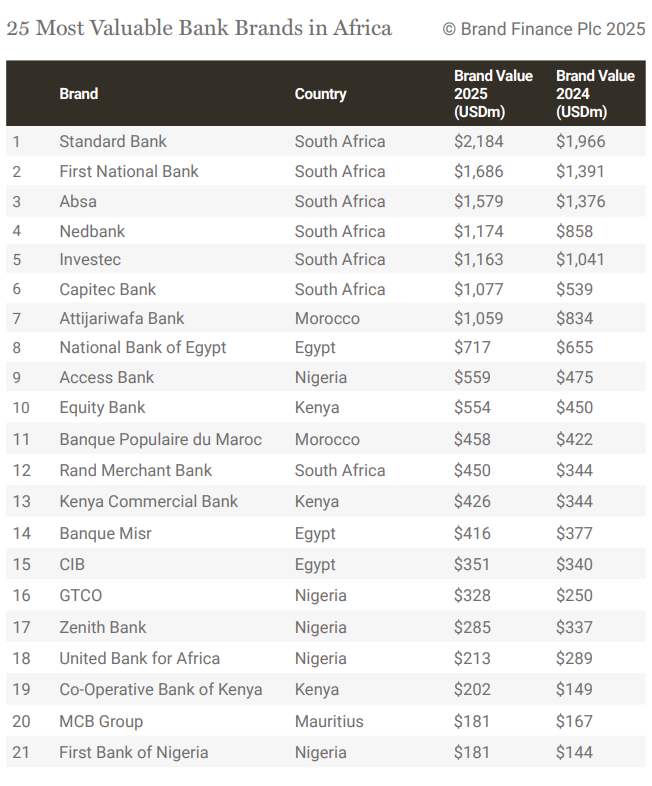 Other noteworthy brands with increased Brand Value in 2025 include South Africa’s Nedbank (+37%) and Rand Merchant Bank (+31%); Kenya’s Co-Operative Bank (+36%) and Equity Bank (+23%); Nigeria’s GTCO (+32%), and Morocco’s Attijariwafa Bank (+27%).