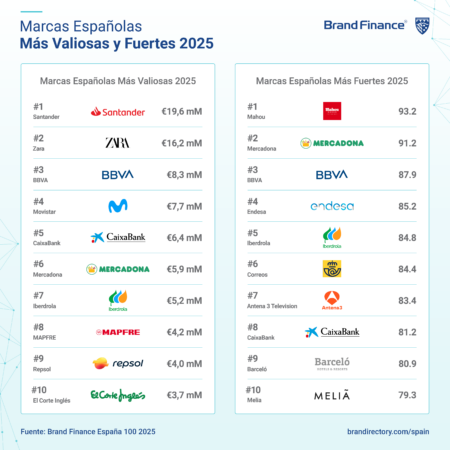 “El sector bancario es el que más contribuye a las 100 marcas españolas más valiosas, con nueve bancos que representan el 29% del valor total del ranking, lo que equivale a 38.800 millones de euros. Esto supone un aumento del 16% con respecto a 2024. El banco Santander se mantiene en la primera posición del ranking como la marca española más valiosa rozando los 20 mil millones de euros”.