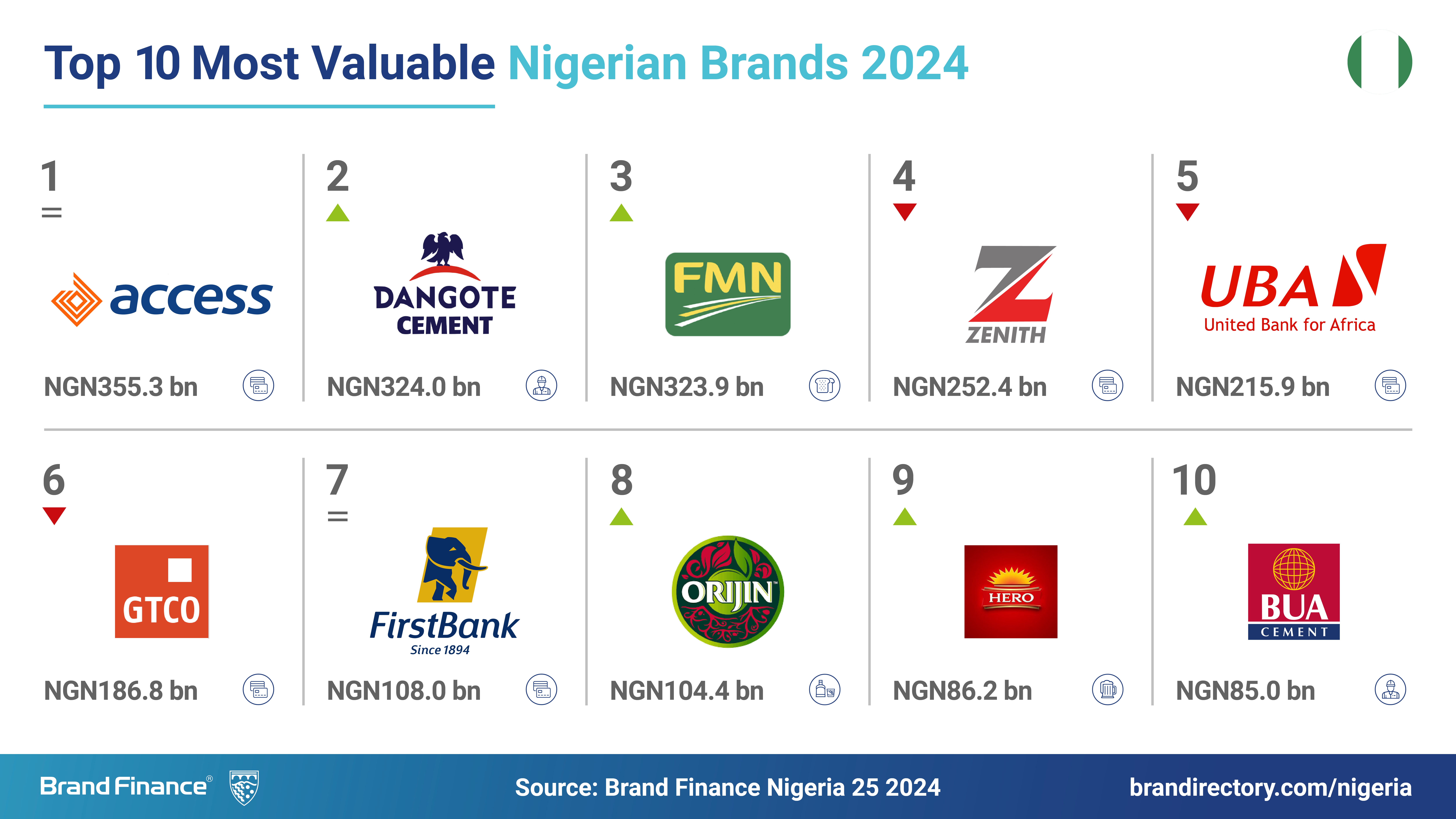 24 May 2024, LONDON – Banking brands collectively contributed 50% of the overall brand value of Nigeria’s top 25 brands, according to a new report from Brand Finance, the world's leading brand valuation consultancy. Within the Nigeria 25 2024 ranking, the most valuable, strongest, and fastest-growing brands belong to the banking sector.