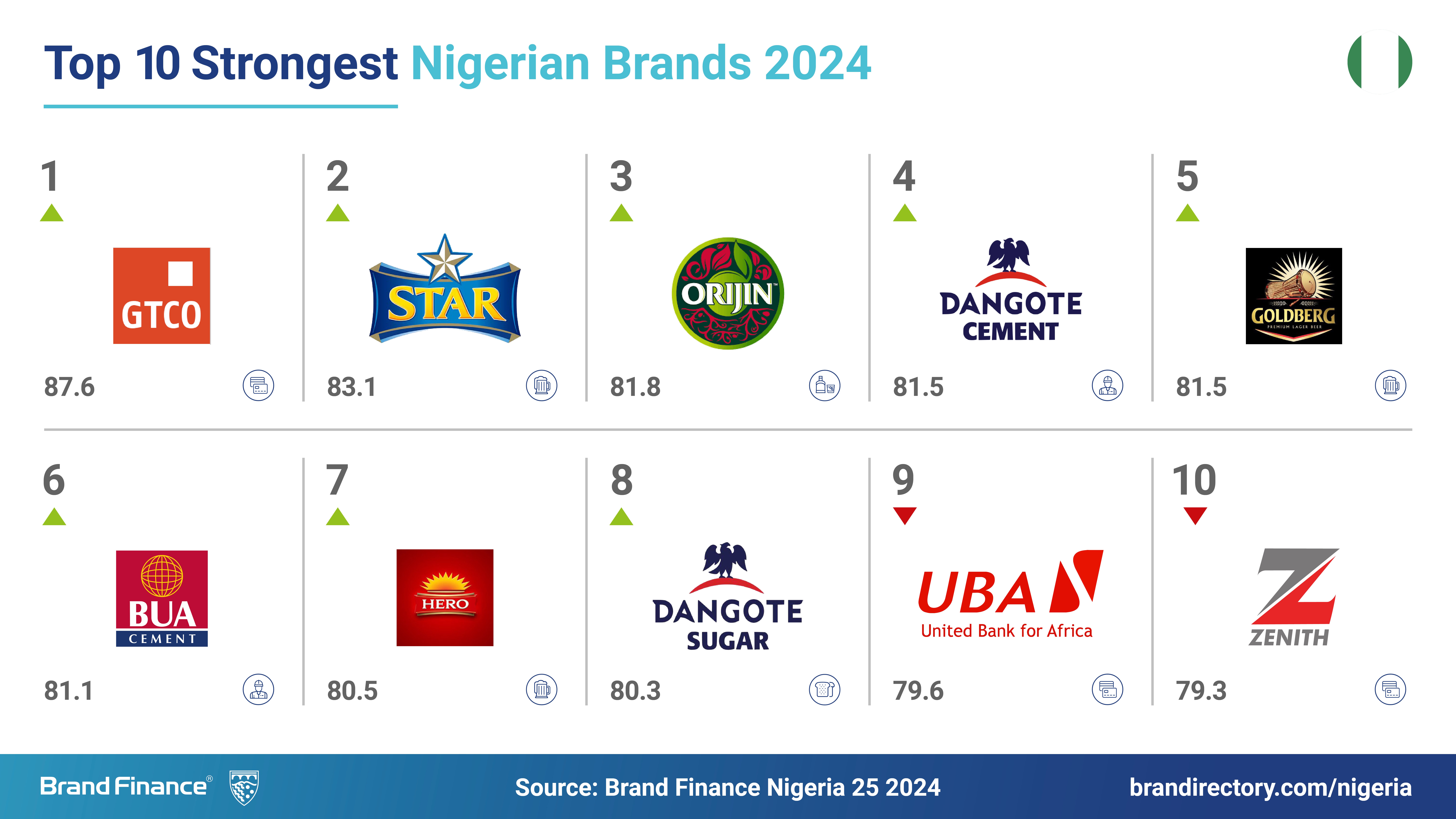 GTCO (brand value up 31% to NGN186.8 billion), Nigeria’s strongest brand, noted impressive scores across consideration, reputation, and price premium. Perceptions of its price premium further highlight the strong position of banking brands in Nigeria, and their ability to command higher prices in response to inflationary pressures. GTCO’s Brand Strength Index score improved more than 4 points to 87.6 out of 100, with a AAA rating.