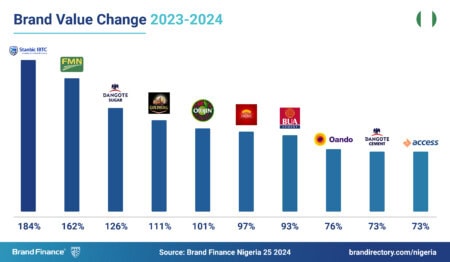 Access Bank maintains its dominance as Nigeria’s most valuable brand, with a 73% increase in brand value to reach NGN355.3 billion. This makes it the 31st most valuable brand across Africa in the Brand Finance Africa 200 2024. The brand value increase stems from improved revenues, primarily driven by significant growth in its interest-based income. Fellow bank Stanbic IBTC’s spiked interest income and improved profits also contributed to a brand value increase of 184% to NGN75 billion, making it the fastest-growing brand in the ranking.
