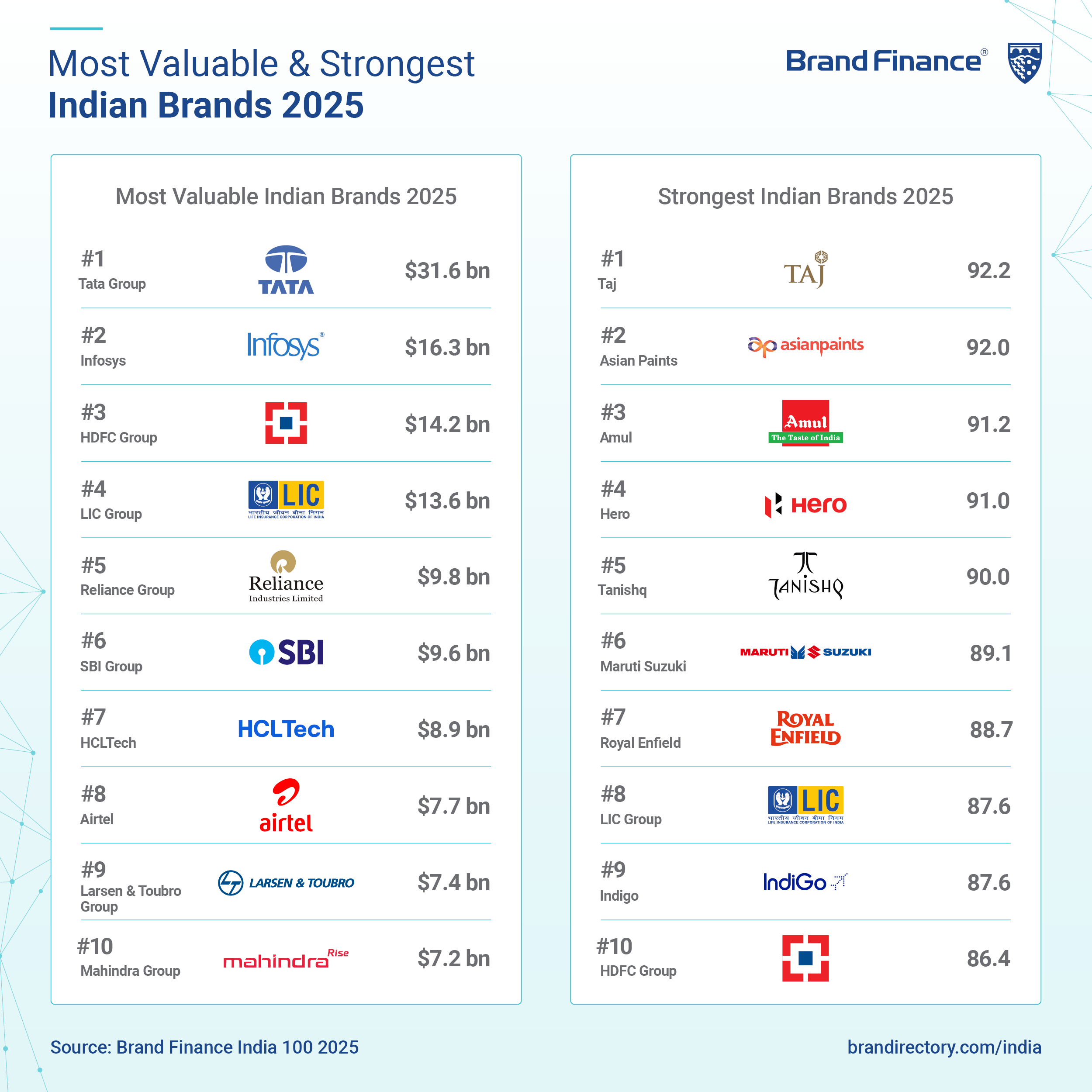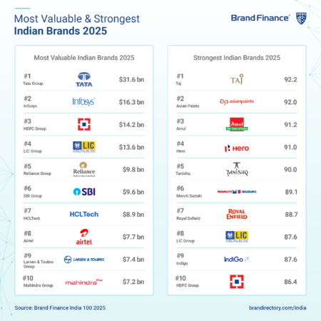 Tata Group (brand value up 10% to USD31.6 billion) has once again secured its position as India’s most valuable brand ranked by becoming the first Indian brand to cross the USD30 billion threshold. This historic milestone underscores India’s expanding economic clout and the Tata Group’s multi-sector dominance, with strategic investments in electronics, EVs, semiconductors, AI, and renewables.
