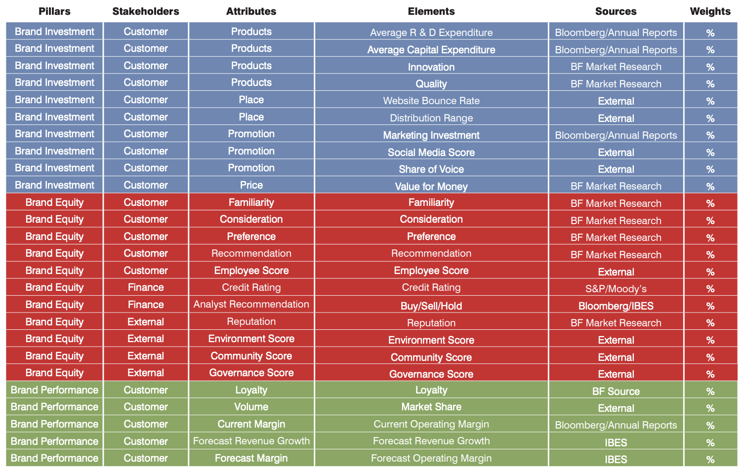 A comprehensive brand strength assessment scorecard that accounts for brand investment and performance, and ultimately commercial success.