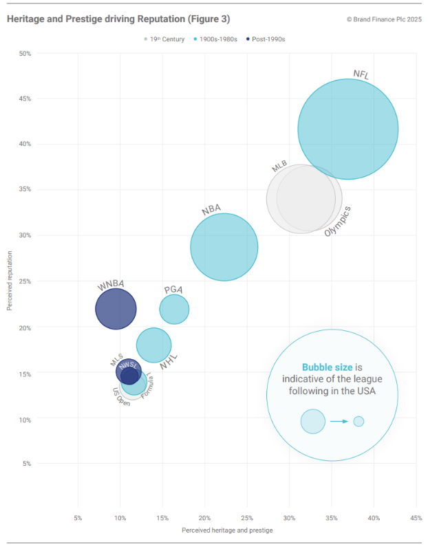 The US Open, despite being one of the oldest competitions (founded in 1881), scores among the lowest on both heritage and reputation, showing that longevity alone does not guarantee prestige in the eyes of the American public. In contrast, the Olympics scores high on both heritage and reputation, despite not being a traditional league or having consistent domestic presence. While heritage can influence reputation, it is insufficient by itself. To sustain perceived prestige, leagues must also remain culturally relevant, high-profile, and emotionally resonant with the public.