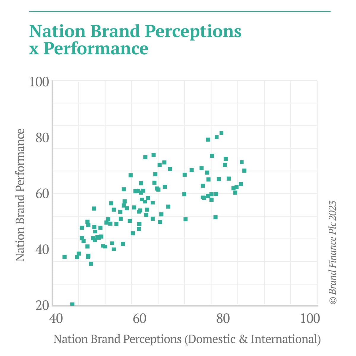 There are five key areas of financial impact that is measured within the Nation Brands ranking: economy, trade, investment, tourism, and talent. Performance across these five areas, combined, generates a Nation Brand Performance score. The relationship between a nation’s performance and its Soft Power is shown in chart below.