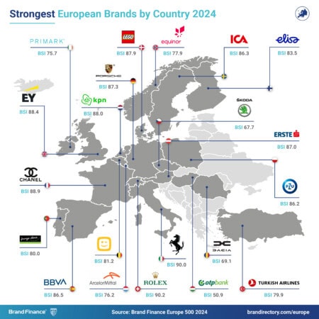 Decathlon (valeur de marque en hausse de 1% à 8.7 milliards d’euros) se classe comme la 10e marque la plus forte d'Europe, ce qui fait de la France le pays avec le plus grand nombre de marques dans le top 10 des marques les plus fortes.