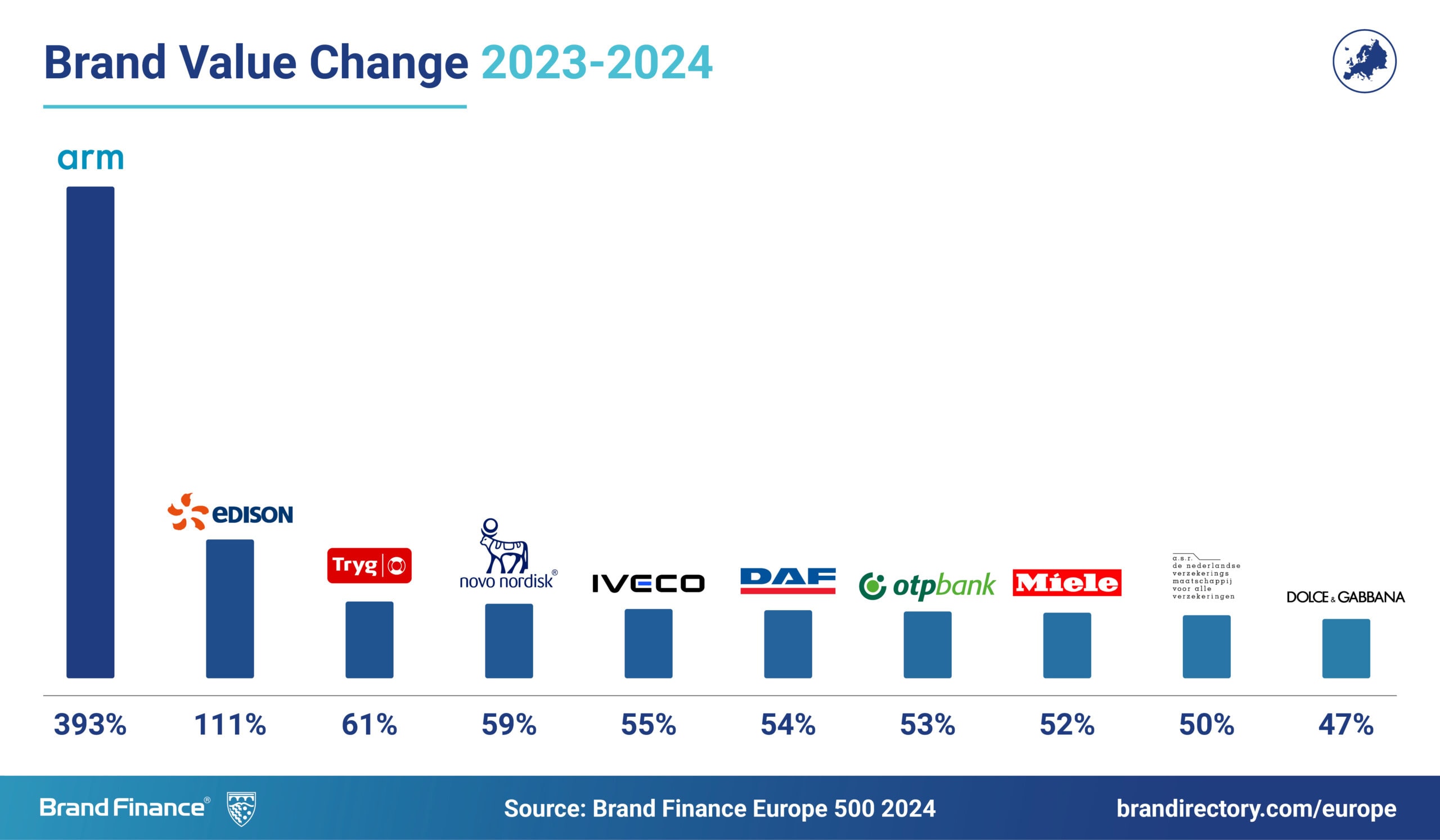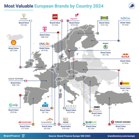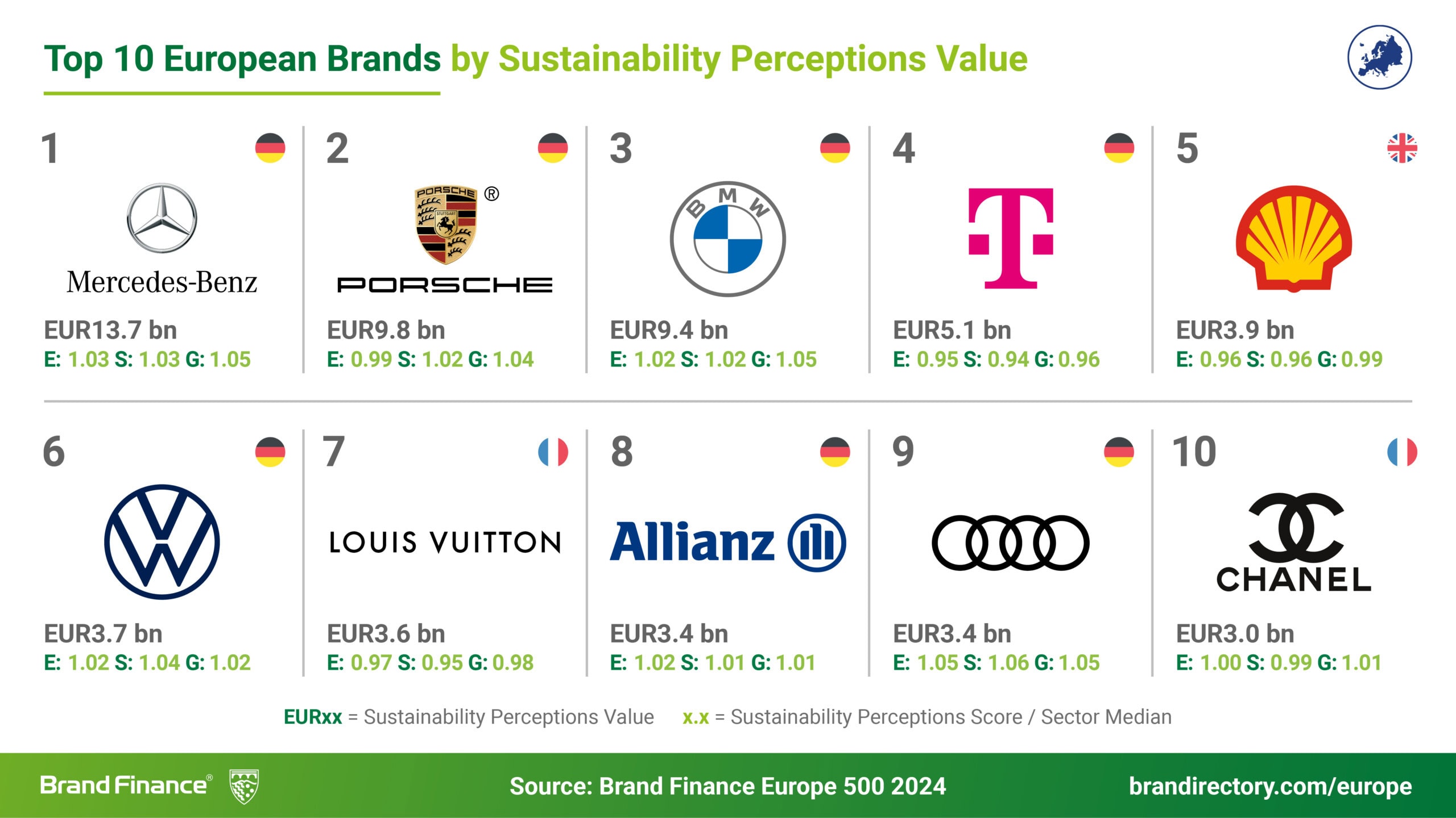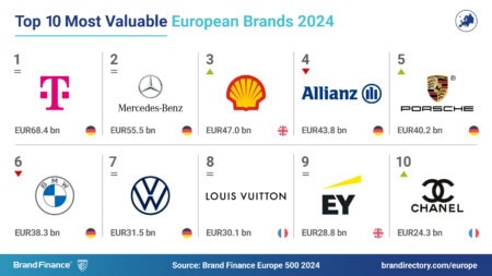 Deutsche Telekom (valeur de marque en hausse de 13% à 68.4 milliards d’euros) est la marque européenne la plus valorisée au monde pour la deuxième année consécutive. Mercedes-Benz (valeur de marque de 55,5 milliards d'euros) occupe le deuxième rang.