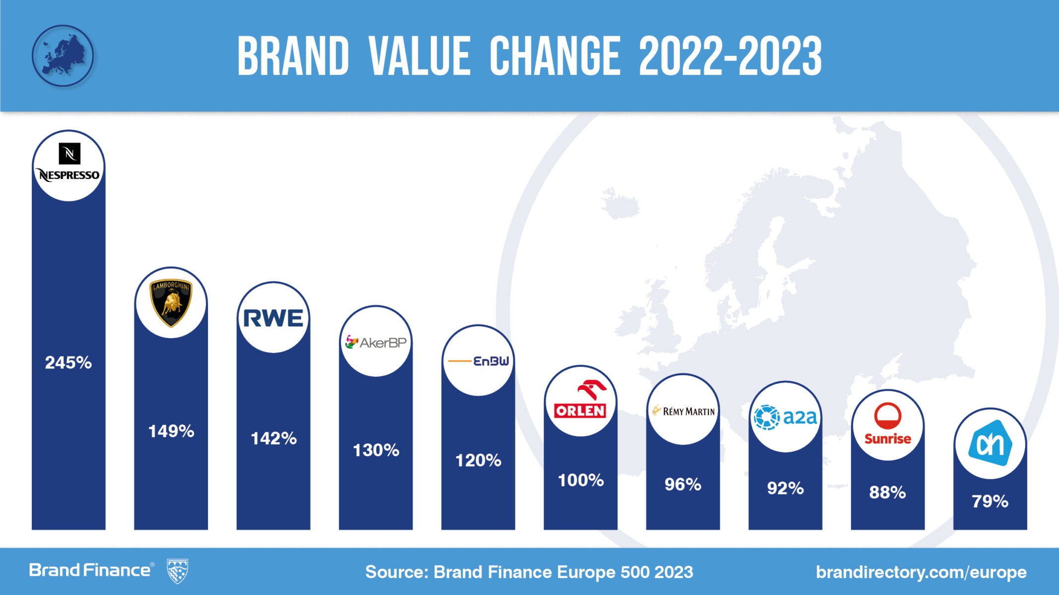 Nespresso è il brand europeo che cresce più velocemente, seguito da Lamborghini. Tra i 10 brand europei che crescono maggiormente c’è anche A2a che ha aumentato il valore generato da immagine & reputazione del 92%. Crescono molto bene, tra i principali marchi presenti in Italia anche Unicredit, Prada, Decathlon, Rolex, Chanel, Armani, Maserati e Conad.