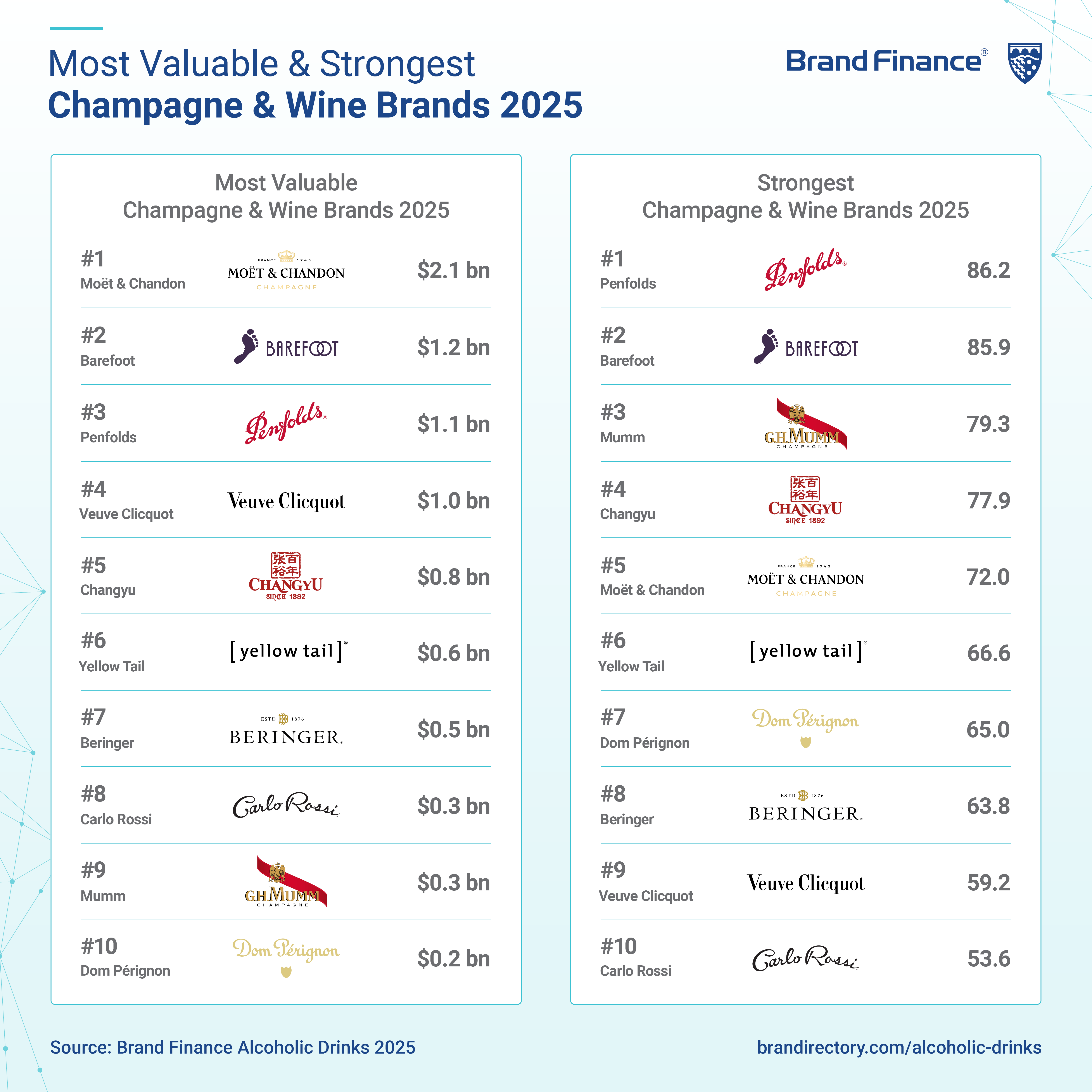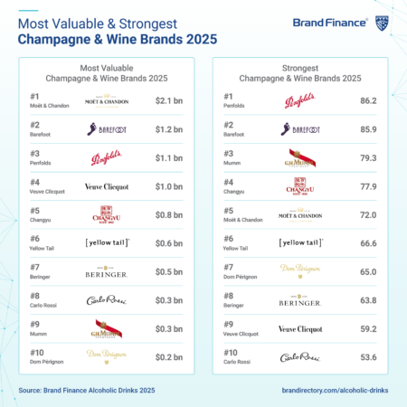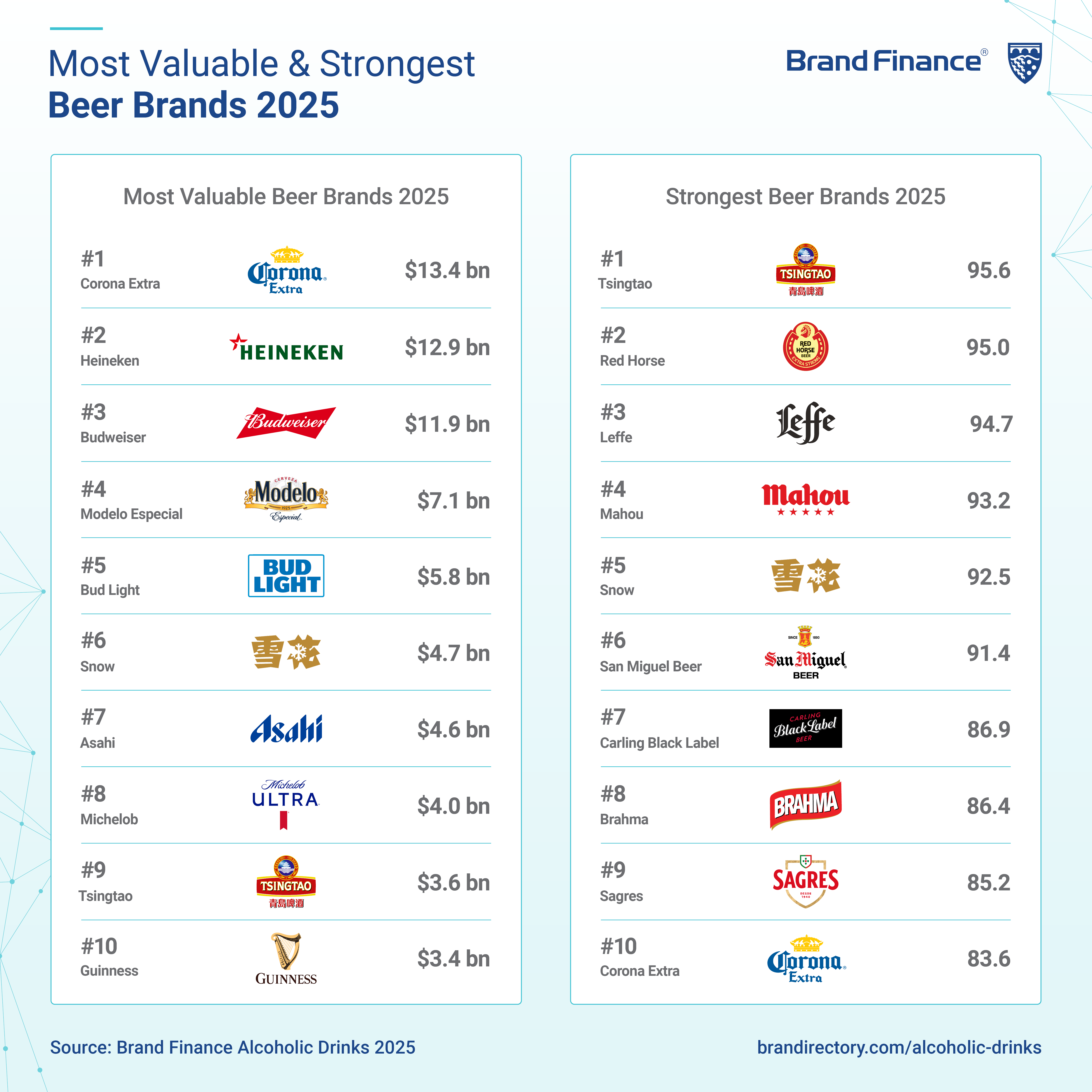Corona Extra se mantiene como la marca de cerveza más valiosa del mundo, con un valor de marca de 13.400 millones de dólares. Heineken y Budweiser se mantienen en segundo y tercer lugar, respectivamente, manteniendo también sus clasificaciones de 2024. La estadounidense Michelob y la china Tsingtao han entrado en el top 10 por primera vez, mientras que Guinness regresa al top 10 por primera vez desde 2018.