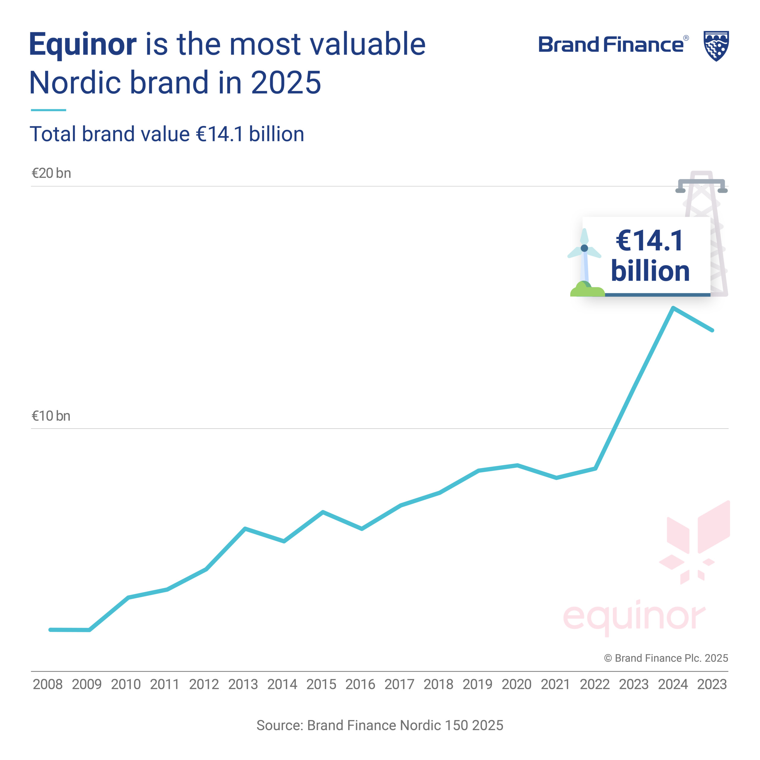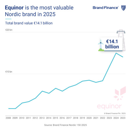 Equinor is the Nordic region’s most valuable brand at EUR14.1 billion. Despite a 10% drop in brand value, the energy company continues to lead in carbon capture projects such as Northern Lights and the CO₂ Highway Europe.