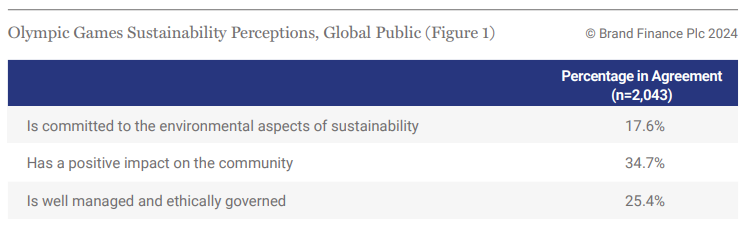 Few amongst the global general public perceive a strong commitment to sustainability at this year’s Olympiad. According to Brand Finance research (Figure 1), 35% see the games as having a positive impact on the community, 25% see the games as well managed and ethically governed, and just 18% associate the games with a commitment to environmental sustainability. However, Paris arguably was an inflection point, setting an expectation for sustainability to be integrated in all future Games.