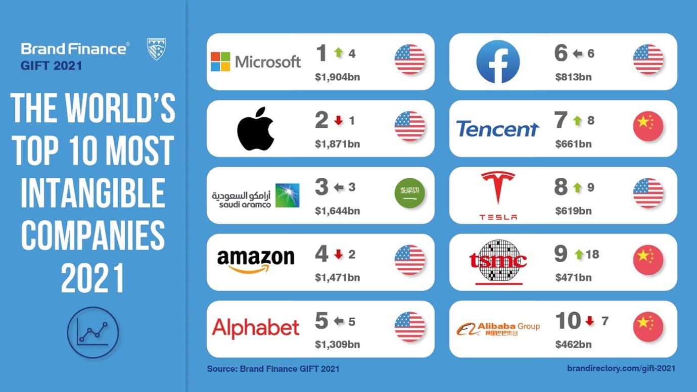 This year’s number one company in terms of total estimated intangible value is Microsoft (US$1.90 trillion), which has jumped from 4th position in 2020 to overtake Apple (US$1.87 trillion), Saudi Aramco (US$1.64 trillion), and Amazon (US$1.47 trillion). Microsoft Teams has become embedded into business life for global organisations, once again proving the value of Microsoft’s ability to innovate and roll-out at scale. Microsoft is investing heavily in its business suite solutions. Although Apple is the more valuable company by approximately $200 billion, Microsoft is estimated to have more intangible value with its portfolio of brands and business operations.