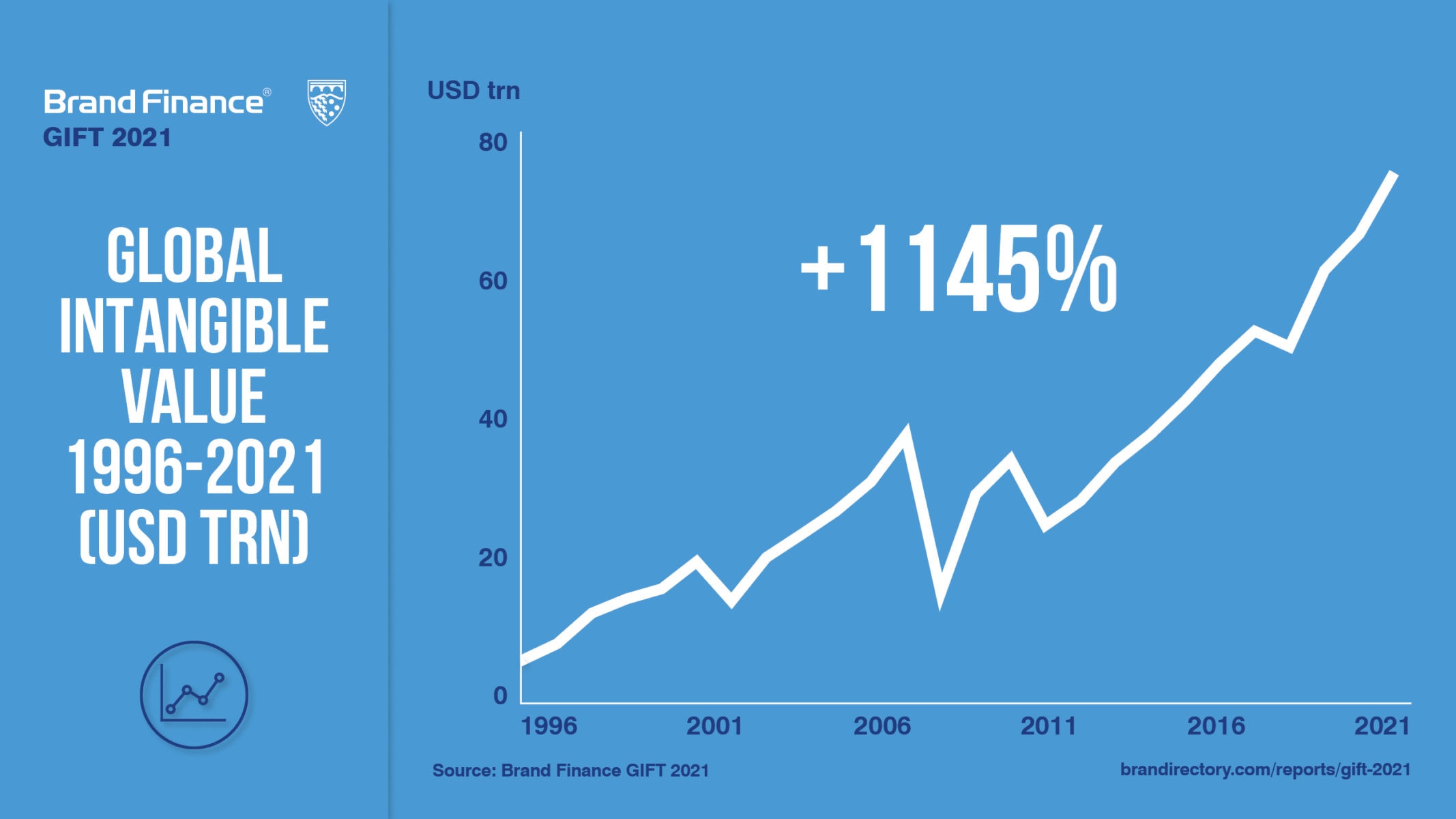 25 years ago – when Brand Finance was established – global intangible assets were worth only an estimated $6 trillion, less than a tenth of the same value today. As of September 2021, global intangible assets are worth over $74 trillion. This is a 1145% growth over 25 years – approximately 11% per annum.
