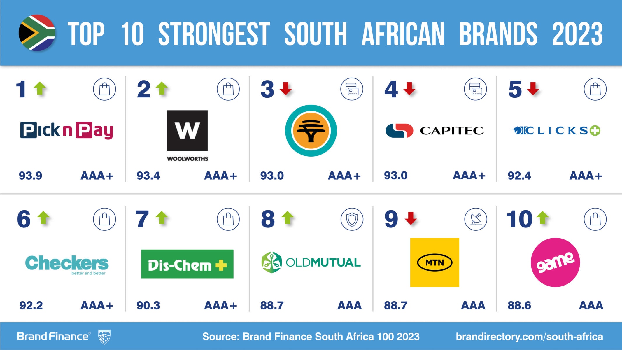 Retail brand Pick n Pay (brand value up 30% to ZAR13.5 billion) has become the strongest South African brand with a Brand Strength Index (BSI) score of 94 out of 100 and corresponding AAA+ rating. Pick n Pay has seen a 14-point BSI increase year-on-year to clinch the top spot for brand strength. Astonishingly, it is one of seven South African brands to achieve the elite AAA+ rating, five of which came from the retail sector. For comparison, only twelve brands achieved AAA+ brand rating in Brand Finance’s ranking of the world’s top 500 most valuable and strongest brands - the Global 500 2023.