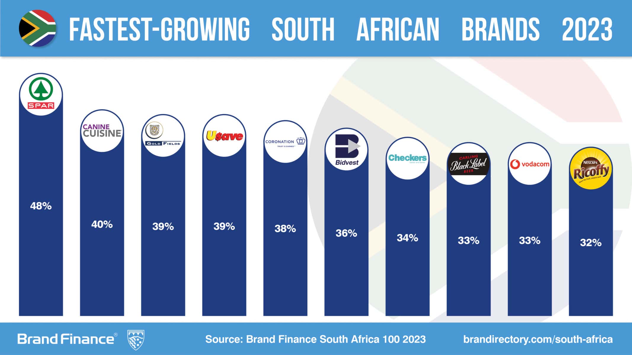 Spar SA is the fastest growing South African brand, up 48% to a brand value of ZAR21.4 billion. Spar SA’s growth reflects a positive outlook for South African retail brands, despite difficult operating conditions over the past year. Spar SA opened 41 new stores in 2022 and was able to record 6% growth in revenue and increased forecast revenues.