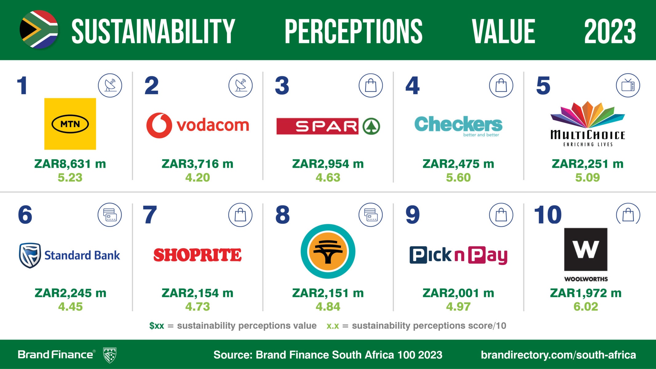 As well as being South Africa’s most valuable brand, MTN also has the highest Sustainability Perceptions Value (SPV) of any brand included in the South Africa 100 2023 ranking - ZAR8.6 billion. This indicates how much brand value MTN has tied up in sustainability perceptions (11.6%). The brand’s Sustainability Perception Score was 5.23 out of 10, the 10th highest in the ranking.