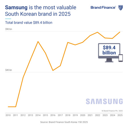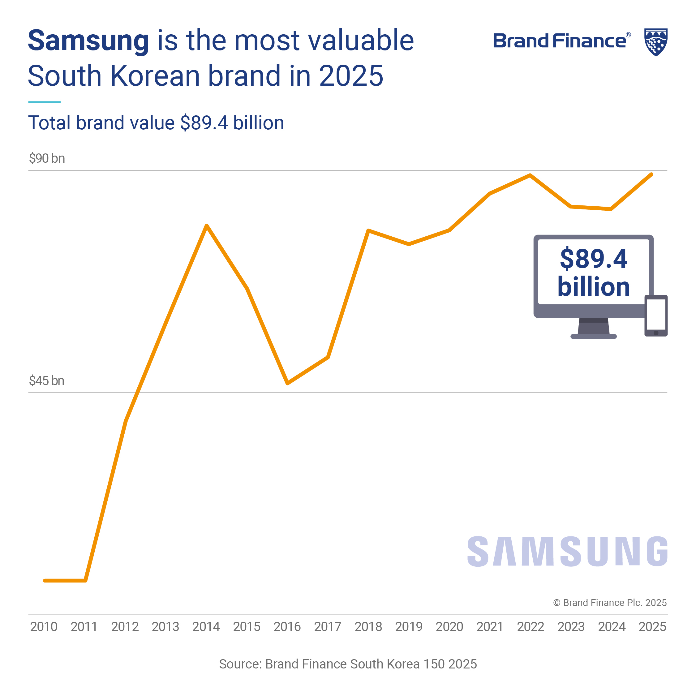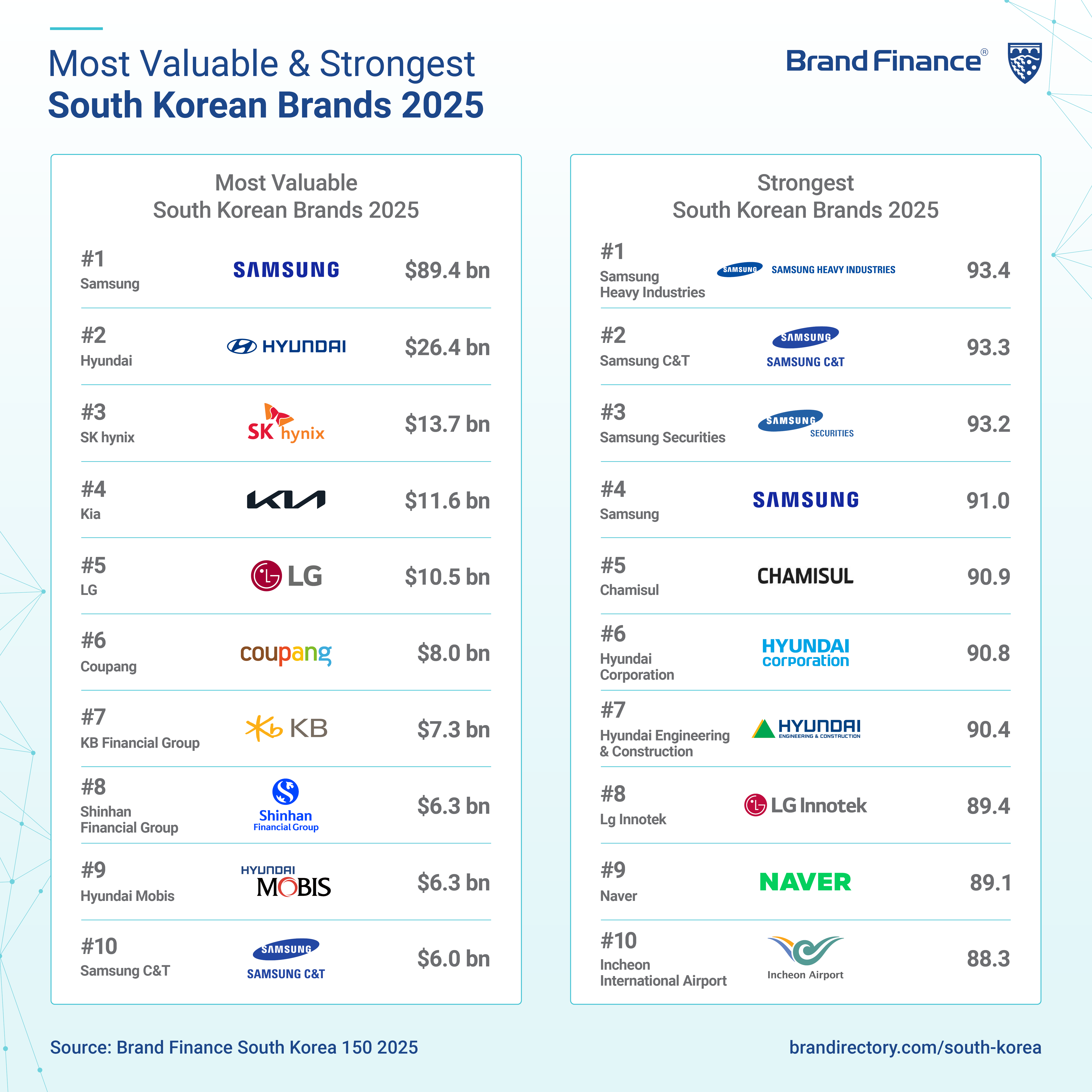The second and third strongest South Korean brands of 2025 are Samsung C&T (brand value up 15% to USD6.0 billion) and Samsung Securities (brand value up 42% to USD618 million) with BSI scores of 93.3/100 and 93.2/100 respectively. Both brands earned an AAA+ brand strength rating.