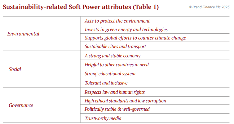 Sustainability goes beyond environmental concerns to encompass social and governance factors, too. In total, 12 attributes which contribute to sustainability (Table 1), are responsible for driving 37% of a nation’s Reputation in the 2025 Index according to regression analysis.