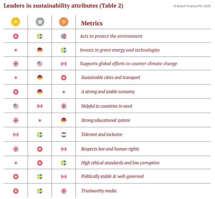 Nordic nations and Western Europe feature heavily in the rankings on sustainability attributes, along with Japan, Canada, the United States, and the United Kingdom (Table 2).