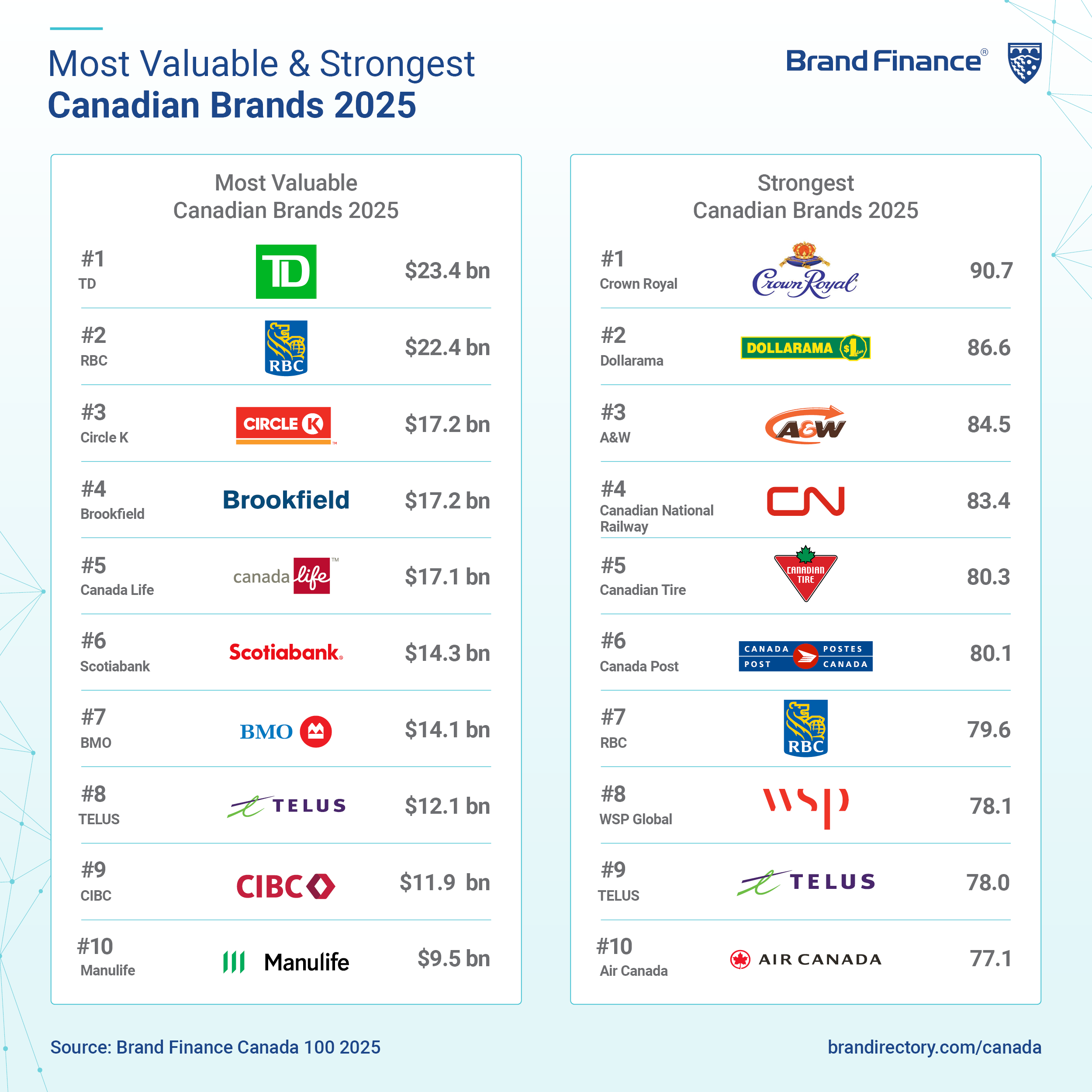 Banking continues to dominate as Canada’s most valuable sector, contributing one-third of the total brand value in the ranking. RBC ranks second overall with a stable brand value of CAD22.4 billion, supported by its integration of HSBC Bank Canada. Four additional banking brands feature in the top 10: Brookfield (up 9% to CAD17.2 billion) in 4th, Scotiabank (down 1% to CAD14.3 billion) in 6th, BMO (down 4% to CAD14.1 billion) in 7th and CIBC (up 12% to CAD11.9 billion) in 9th.