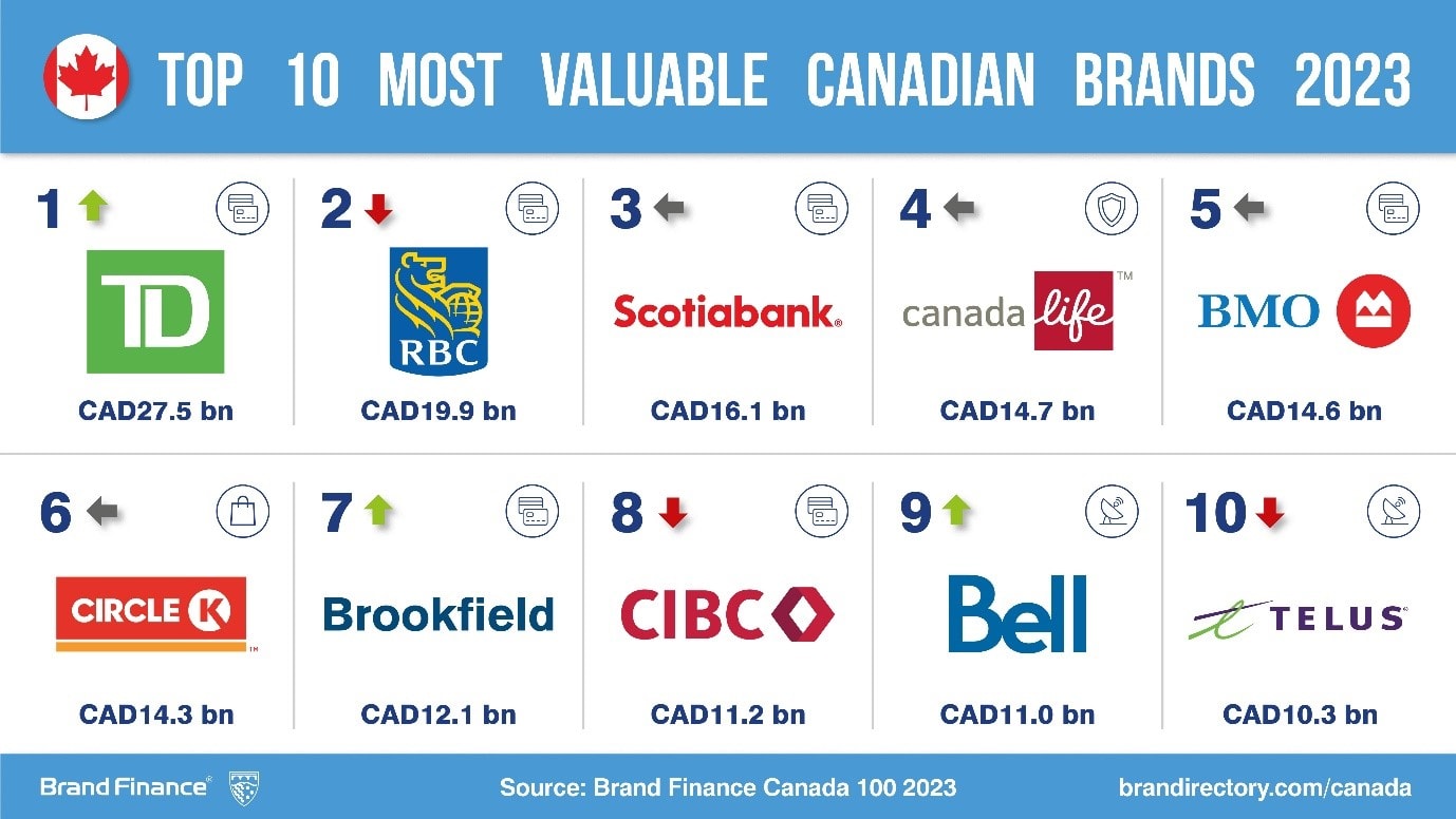 TD (brand value up 27% to CAD27.5 billion) has remained resilient to widespread challenges and achieved impressive brand value growth, becoming Canada’s most valuable.