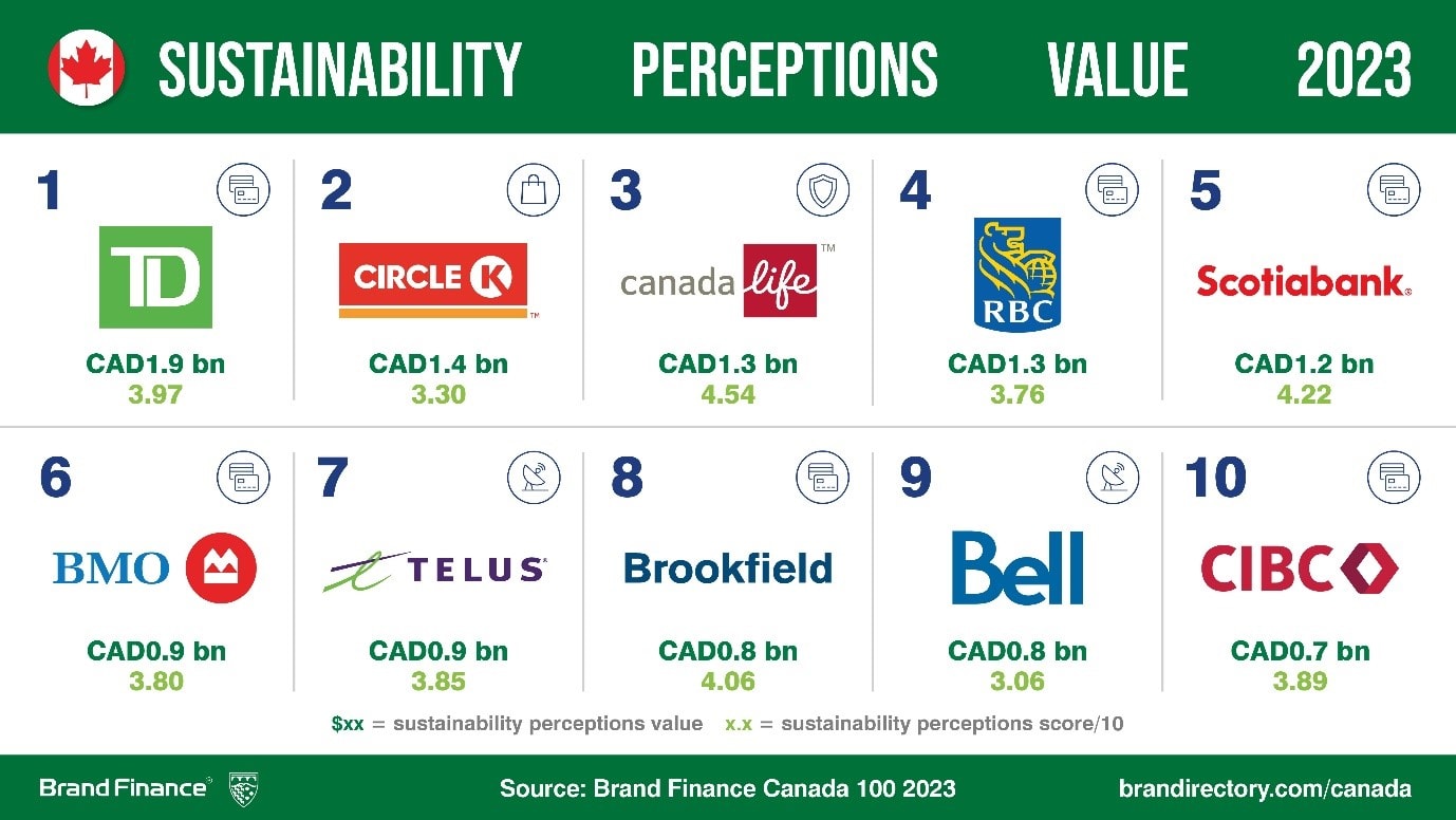 TD has the highest Sustainability Perceptions Value at CAD1.9 billion