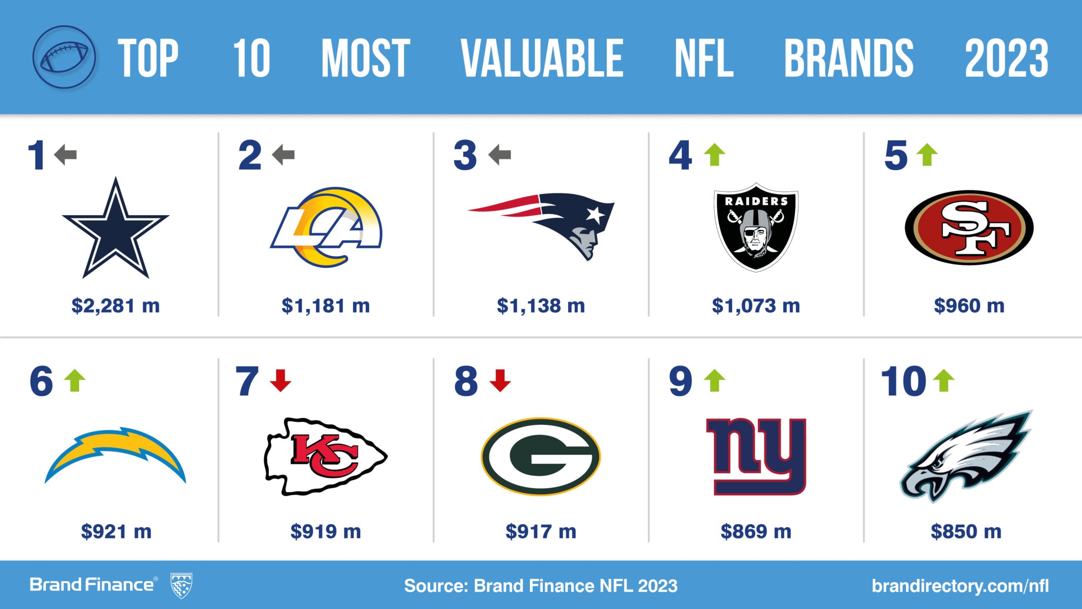Every year, leading brand valuation consultancy Brand Finance puts 5,000 of the biggest brands to the test, and publishes over 100 reports, ranking brands across all sectors and countries. The NFL’s most valuable and strongest brands are included in the Brand Finance NFL 2023 report.