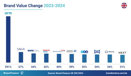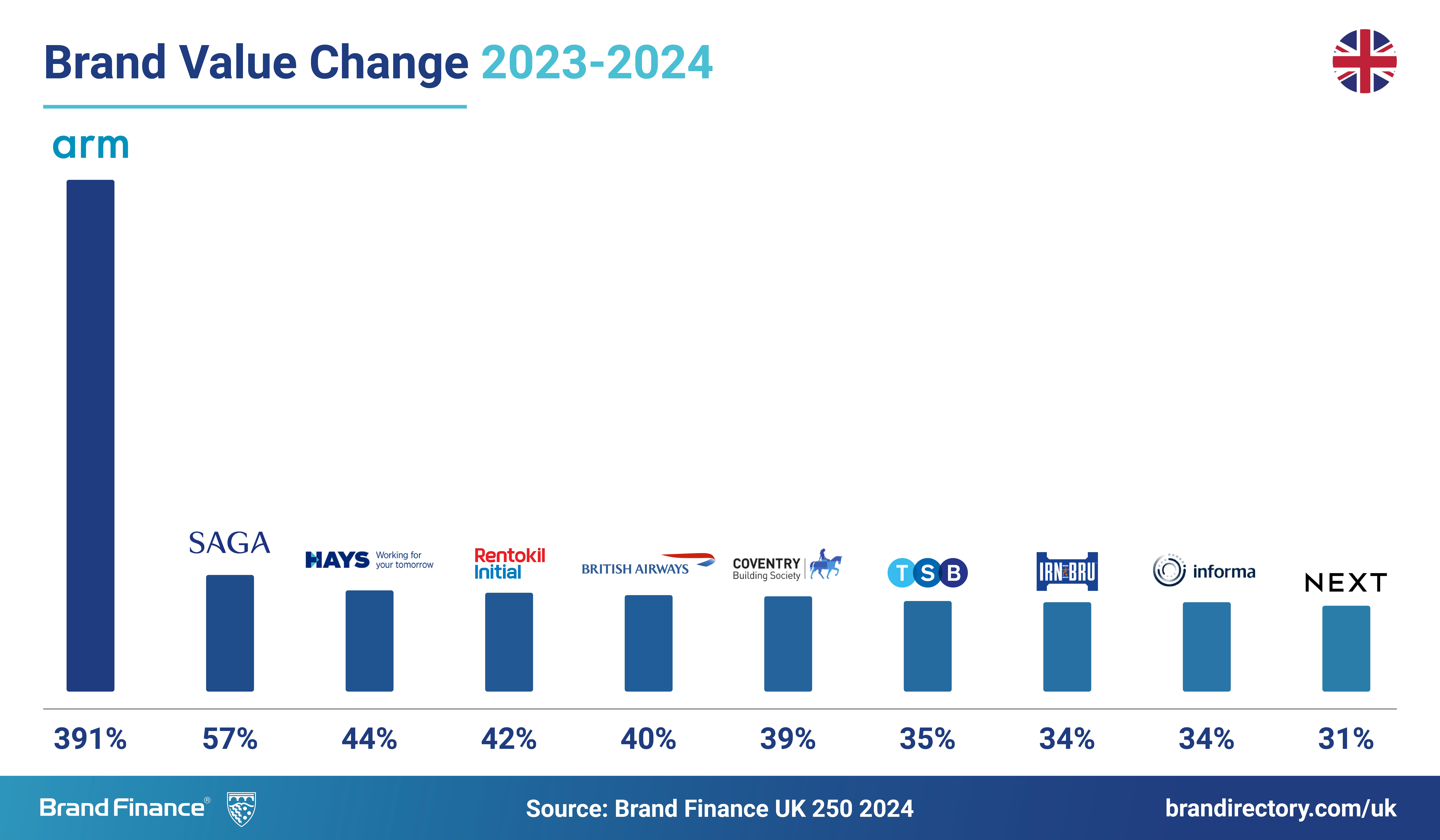 Arm’s brand value has surged in value to GBP945 million, and is now worth almost five times more compared to last year. This surge results from the semiconductor and AI boom, along with the brand’s unique IP licensing model. Since its return to the public market in 2023, Arm has consistently surpassed expectations, in line with the trend of AI and semiconductor brands, further bolstering brand value.