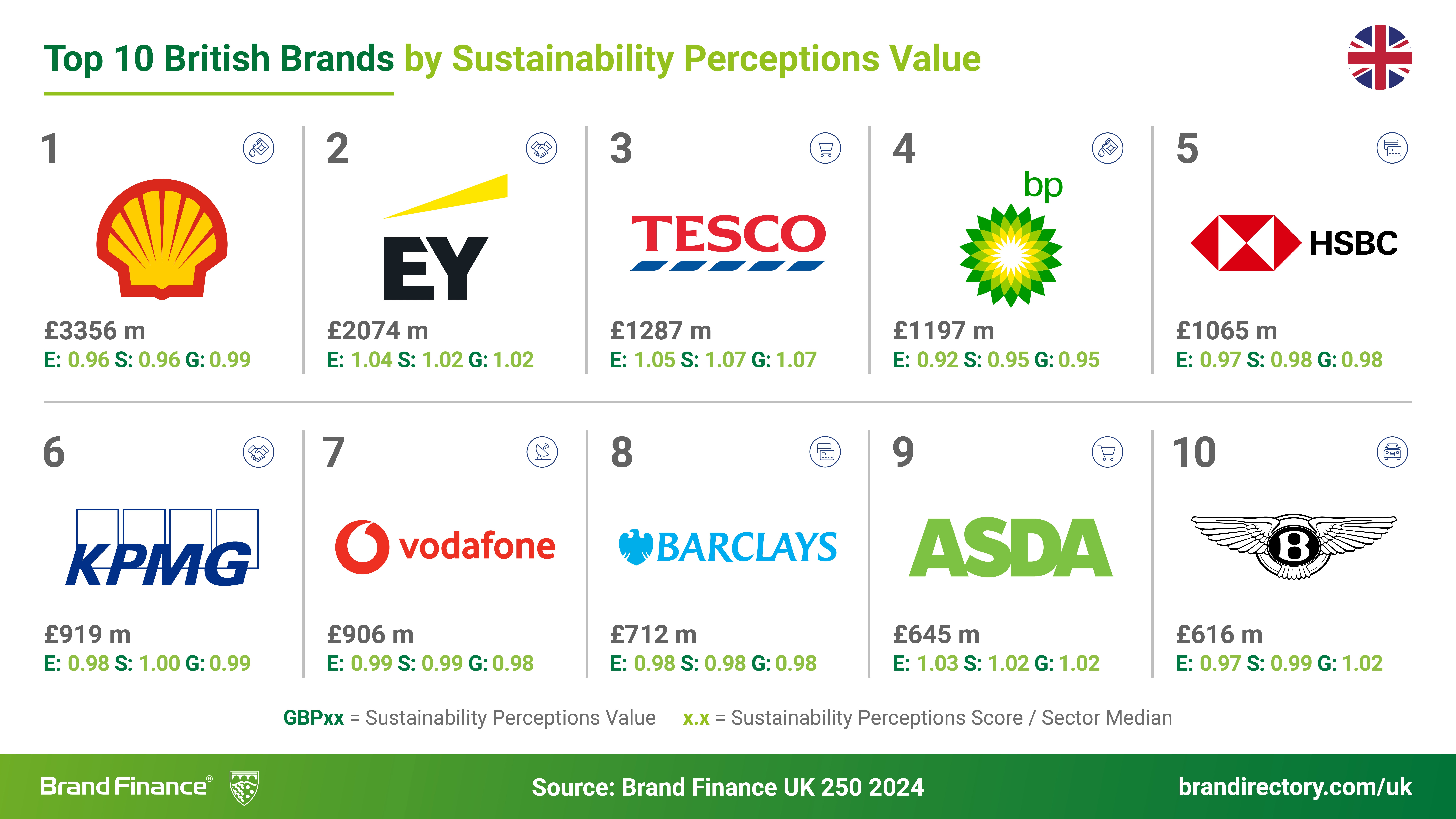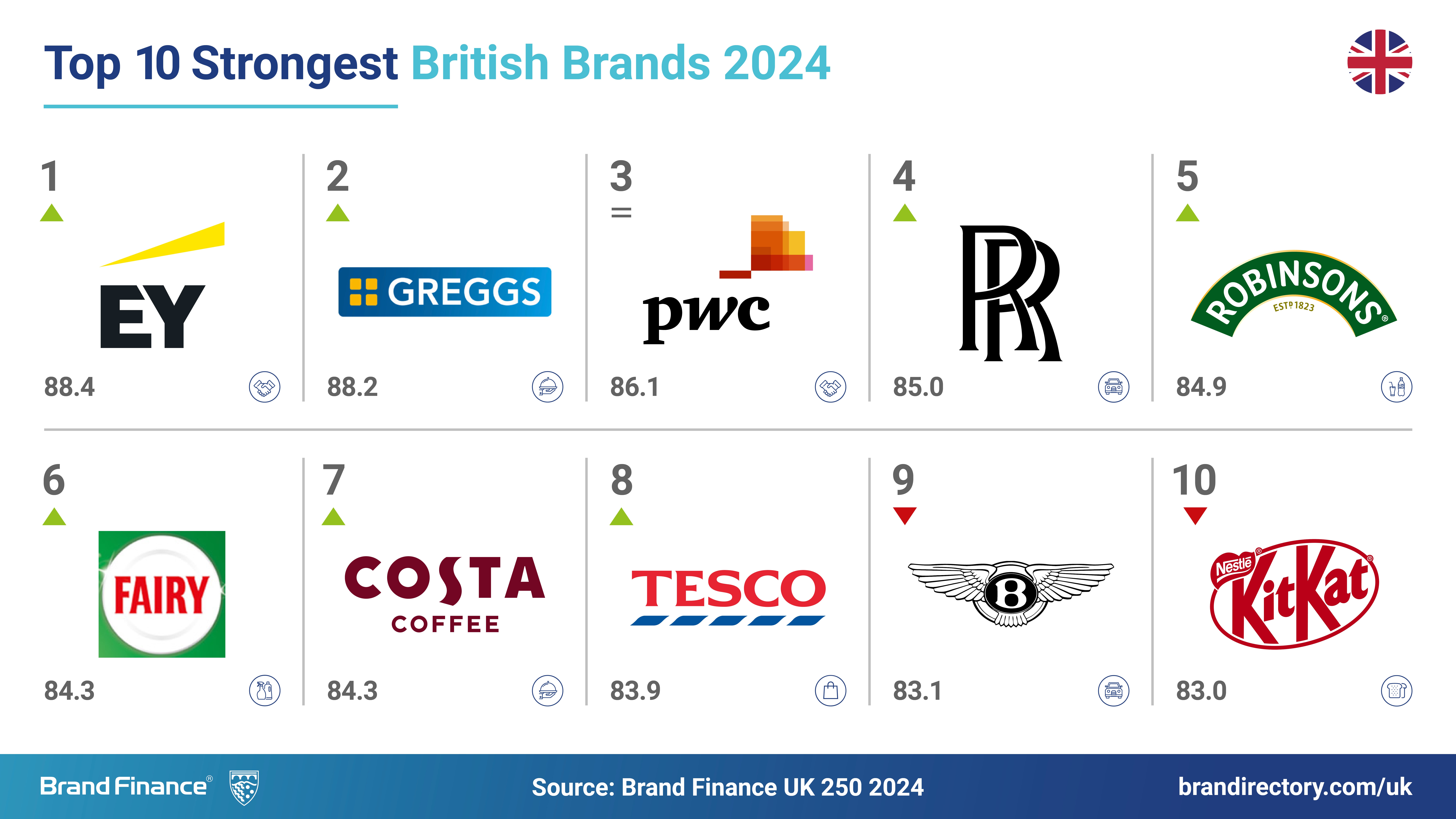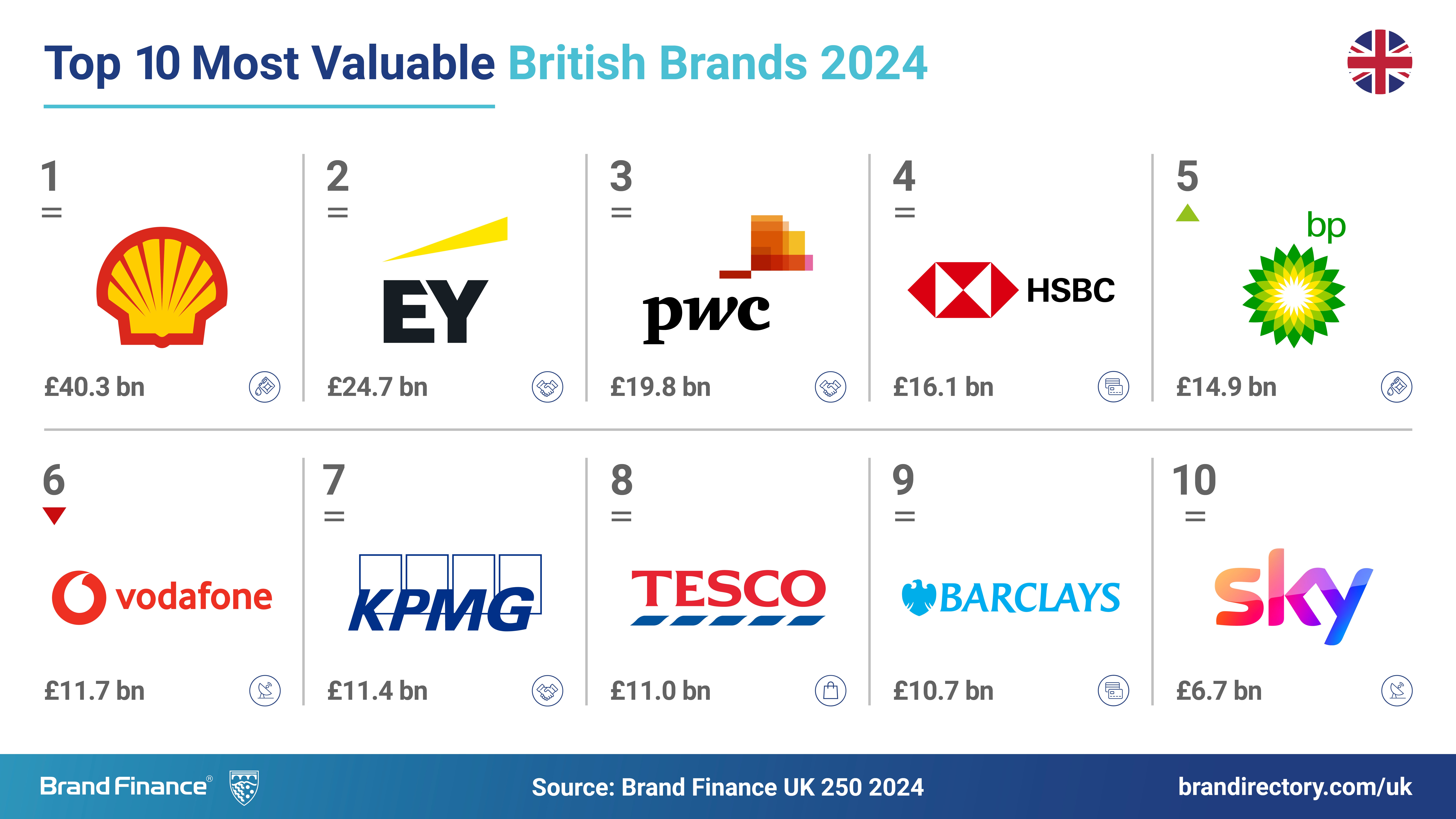 Shell reinforces its title as the UK’s most valuable brand, recording a 1% increase in brand value to GBP40.3 billion. This is particularly notable given the backdrop of falling revenues, a decline in enterprise value, and a drop from an AA+ rating to AA in terms of brand strength. EY (brand value up 16% to GBP24.7 billion) has maintained its standing as second most valuable UK brand and has now emerged as the nation’s strongest brand. EY’s growth contrasts rival UK Big Four brands PWC (brand value down 6% to GBP19.8 billion) and KPMG (brand value down 8% to GBP11.4 billion), ranked third and seventh, respectively.