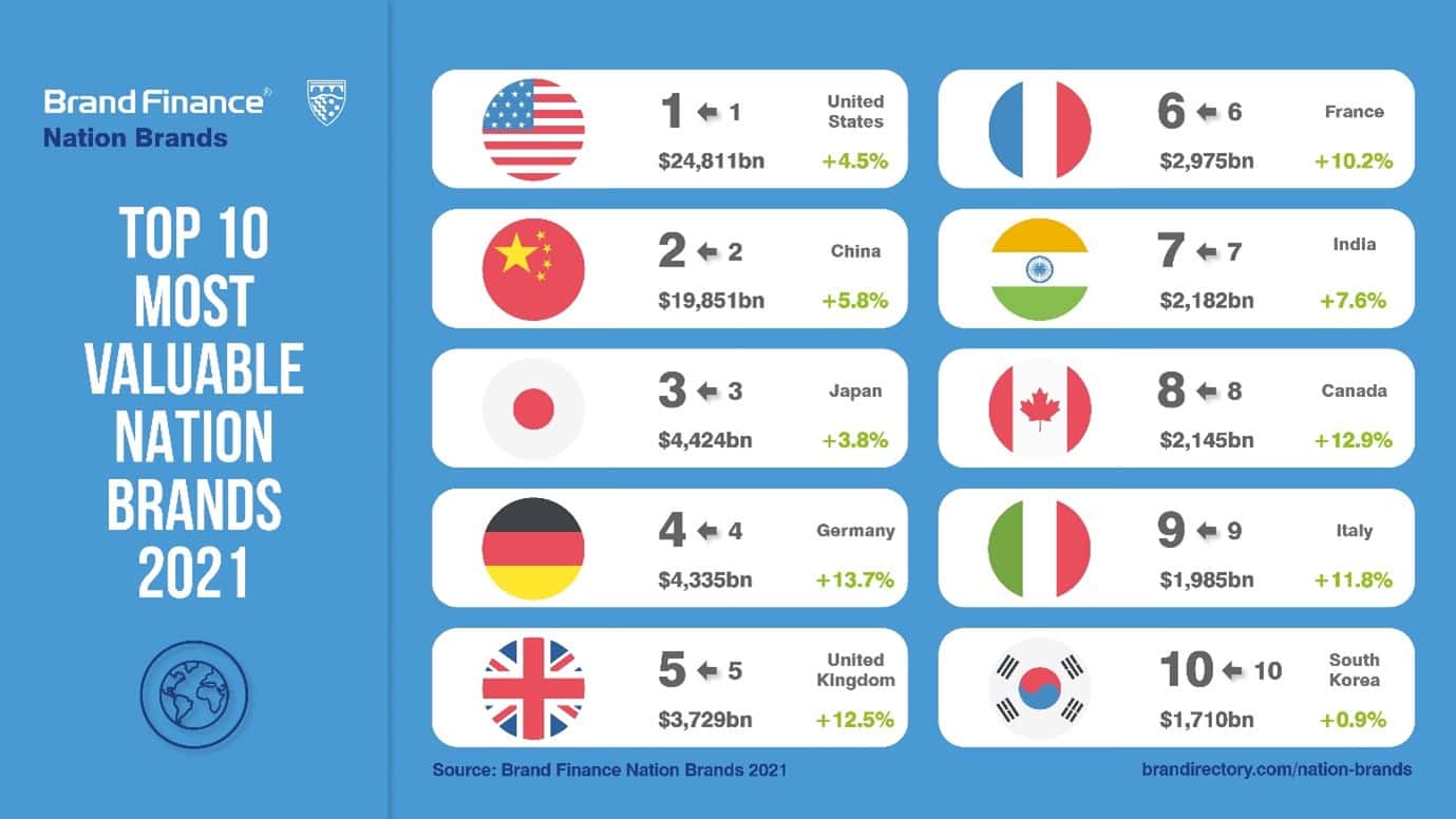 Every year, Brand Finance values 5,000 of the world’s biggest brands. The 100 most valuable and strongest nation brands are included in the Brand Finance Nation Brands 2021 ranking.