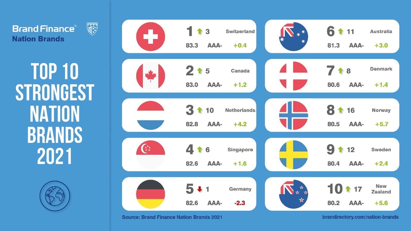 Australia, up five places in the ranking to 6th, and New Zealand, up seven places to 10th, have both entered the top 10 for brand strength, with BSI scores of 81.3 and 80.2 respectively. The Australasian countries were deemed to have handled the early days of the pandemic extremely well. Both were lauded for their severe lockdowns and quick reaction to subsequent outbreaks, which resulted in minimal cases and allowed them to open back up internally considerably earlier than others.